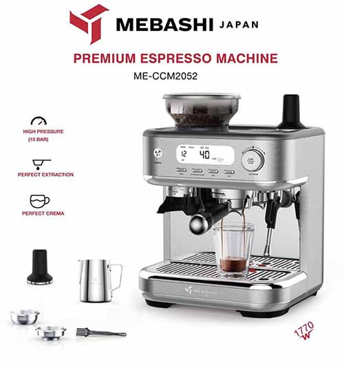 لوازم جانبی : تامپر پودر قهوه (فشاری), ظرف شیر, یک عدد پرتافیلتر, یک عدد سبد پرتافیلتر تک شات, یک عدد سبد پرتافیلتر دو شات